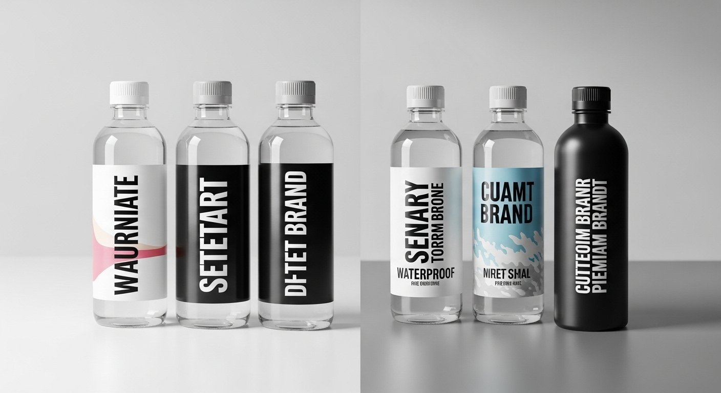 Waterproof and durable bottle labels with strong adhesive. Perfect for branded water bottles and beverages.